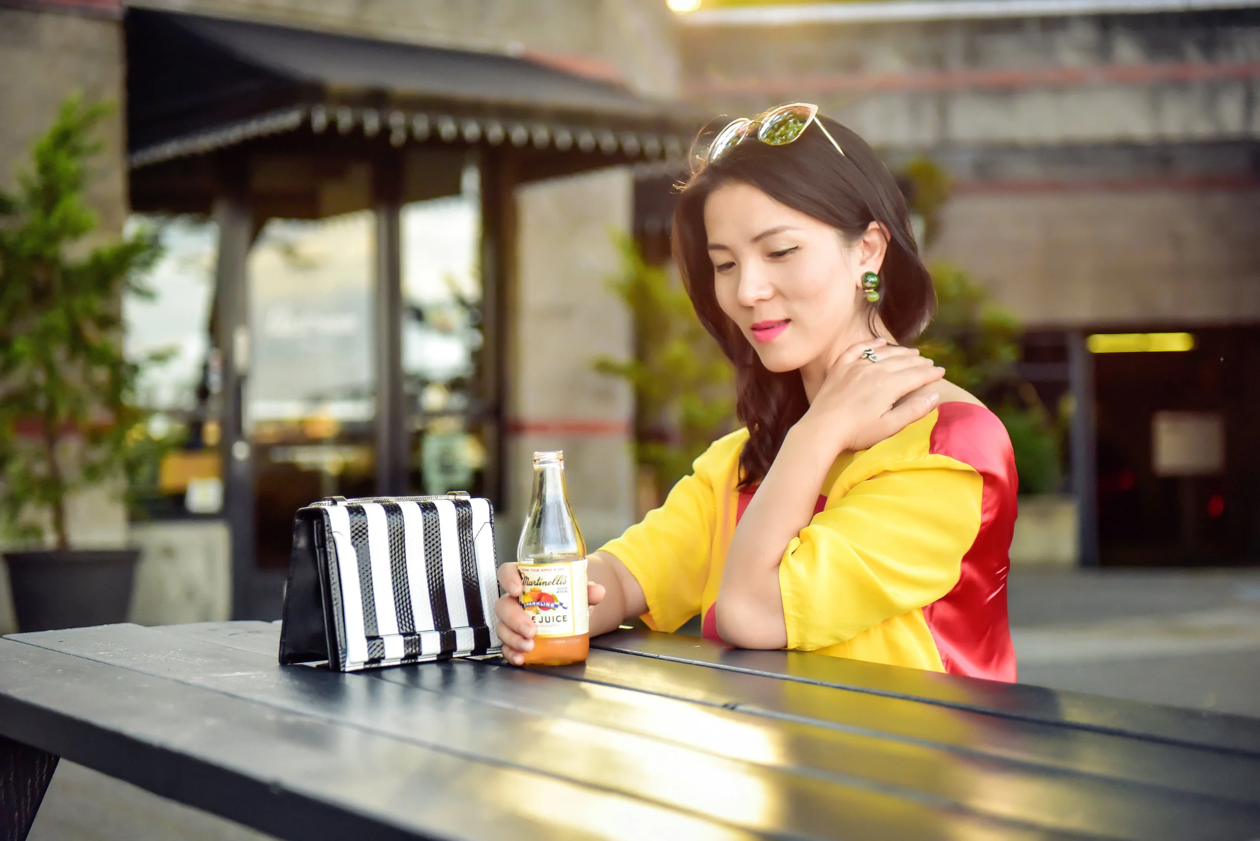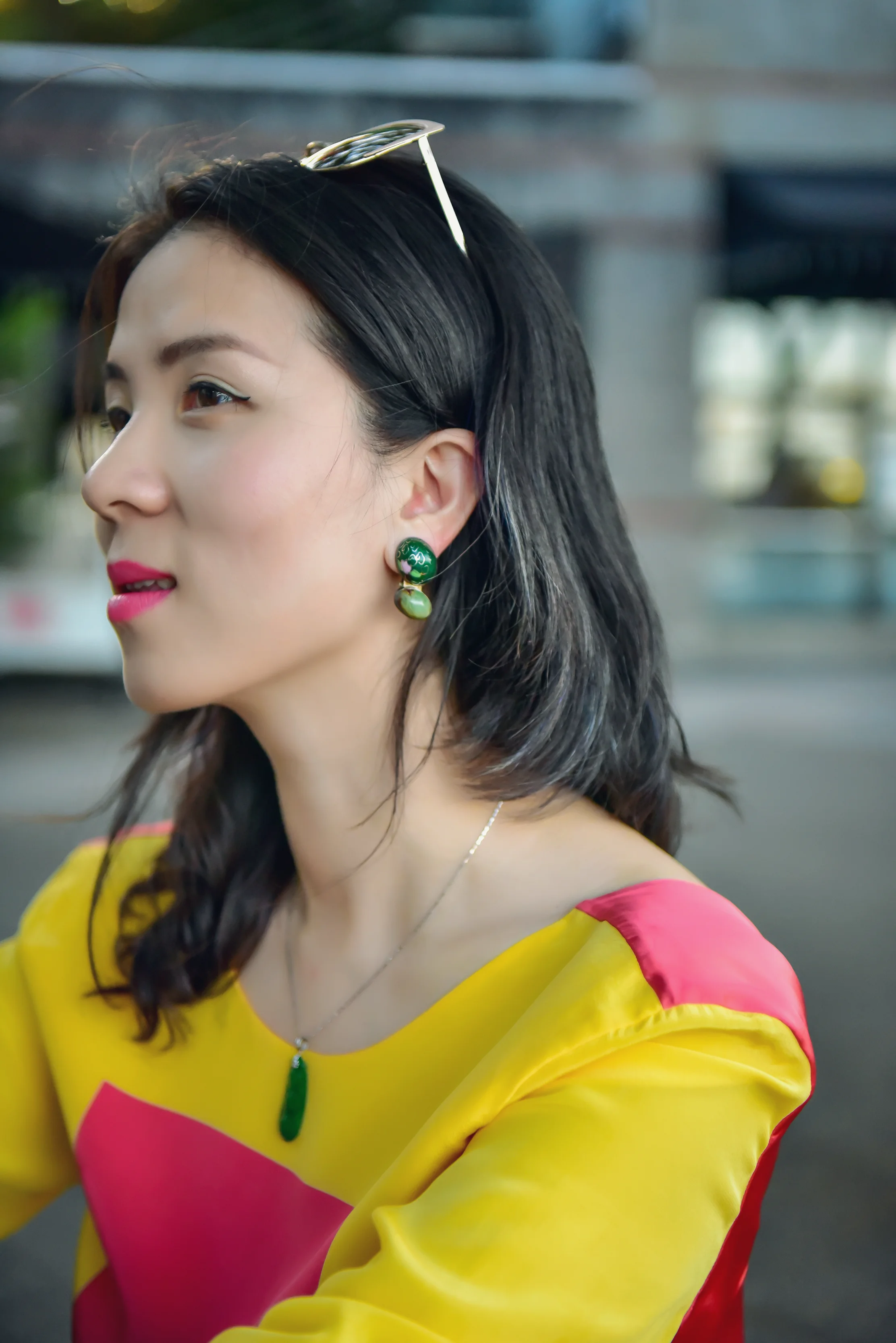 When you wearing colorblock dress like this, you could use neutral color for everything else to pop out the dress itself. Or you can also do what I did by adding another color to it. As you can see, I added green earring and green necklace as the third color theme to the overall look. I could also use a green purse, but then it would be too much green. Instead, I chose this purse to break the three color theme and also add a bit of modern feel.