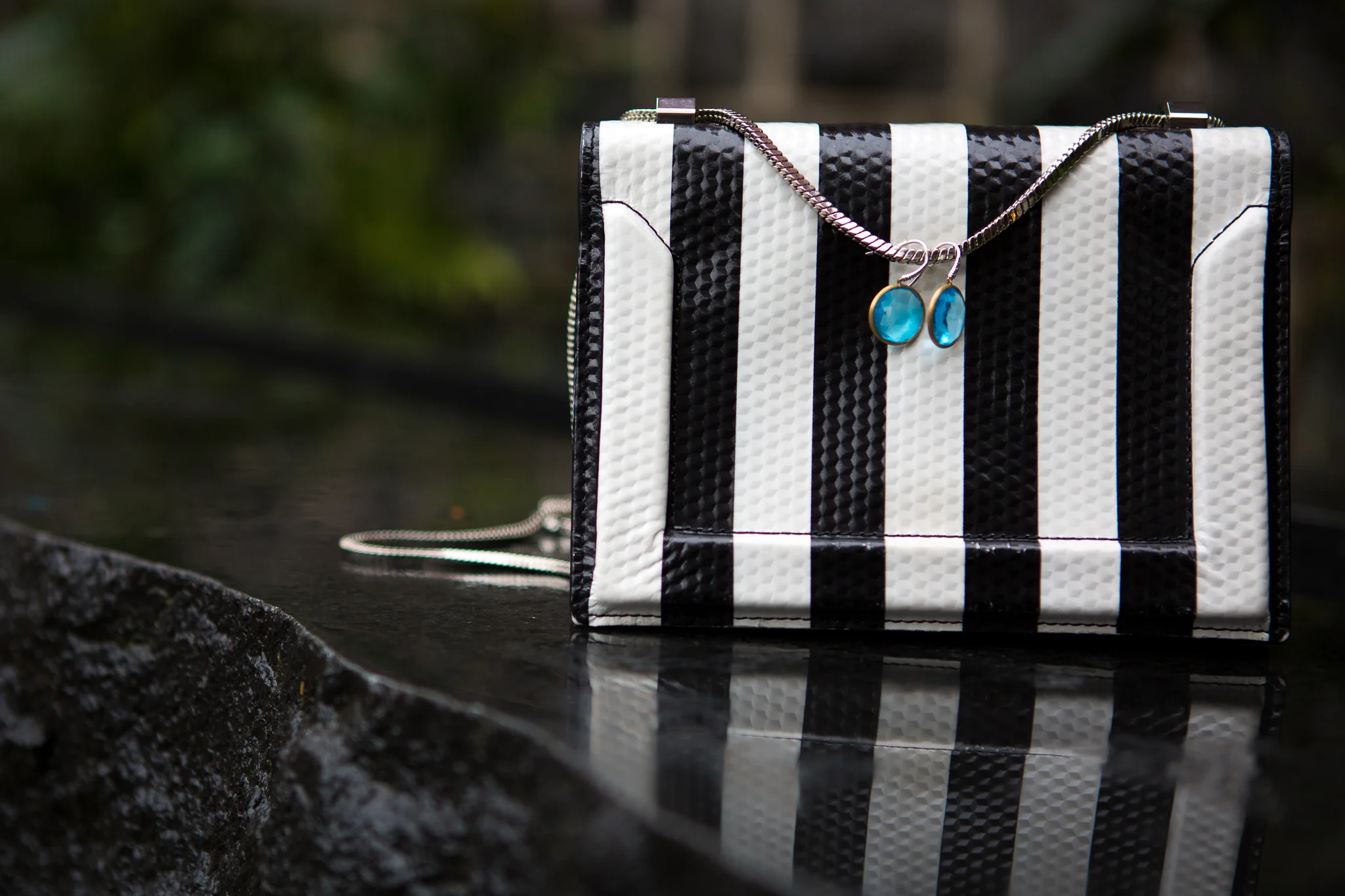 Pairing a black and white stripe pattern with another busy pattern such as this crystal print dress creates an edgy pairing. This may not always work to pair; but apply an 80%-20% rule. : )