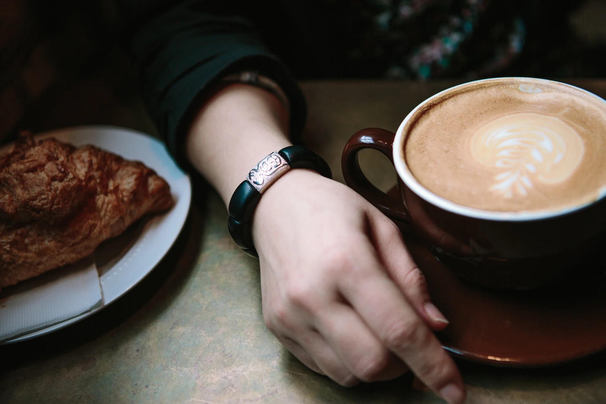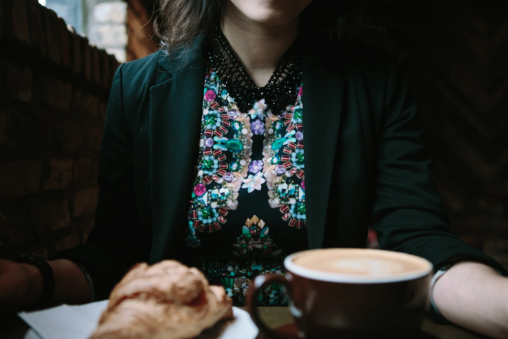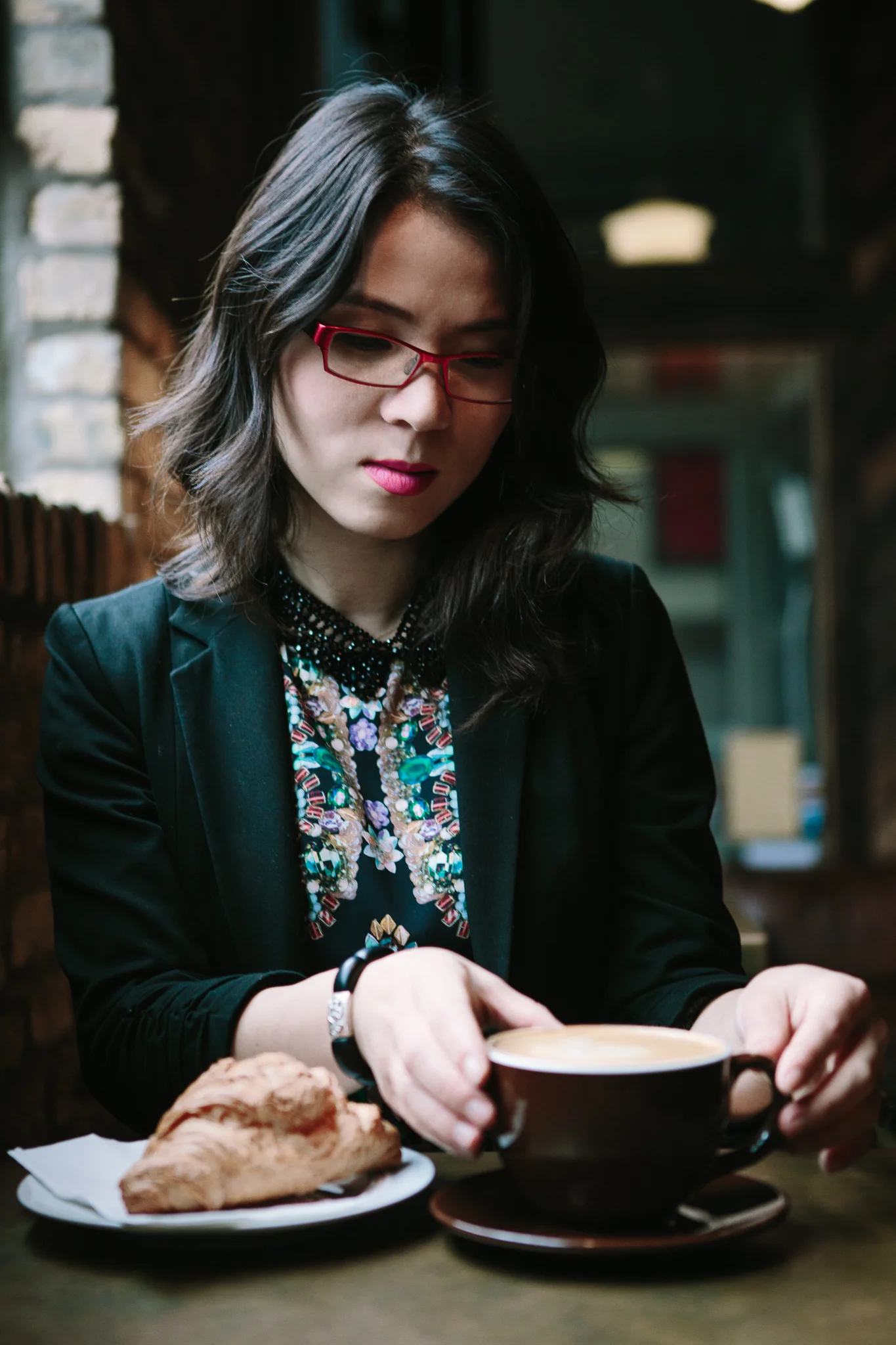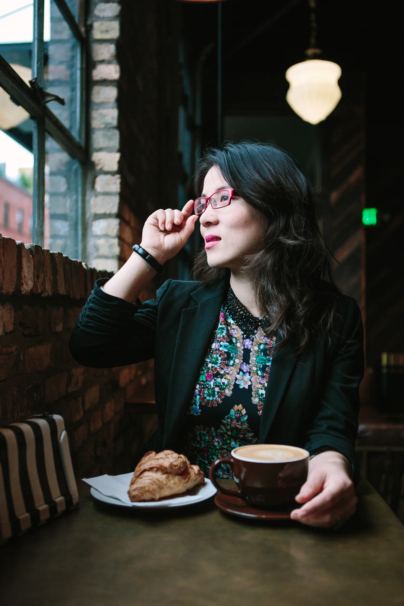 Technically I should have "plenty" of time to enjoy a cup of coffee at ease in a café. Well, like most of you, my day gets filled with pursuits and responsibilities like two young boys, my high standard for house organization/tidiness, and my various creative outlets.... etc... So I made an extra effort to have a nice café day.My photographer Andrew suggested Black Rock Coffee Bar Cafe. I fell in love with this cafe the moment I walked in. It is spacious, sophisticated and upscale. The bookshelf in the back with a reading light has a very comfy couch. The brick wall, wood furniture, metal legs, and leather couch create textures with great harmony.In today's look, I applied a very typical pairing technique which in fact is one of my personal favorite: short jacket over a dress. This Nicole Miller crystal-print sheath dress shapes with the body. If you have a rectangle, or pear/apple shaped body type, then this might not be a ideal choice for you. I layered a black jacket over the dress for two purpose: 1) to tone down the colorfulness of the crystal-print, 2) to keep myself warm during the Fall. You might ask why I picked a short jacket instead of a long jacket. Because this dress showcases my body, I don't want to cover completely by layering a long jacket. A jacket that sits just above the waistline becomes a perfect length to add sophistication while still allowing the dress to be the focal point. I picked open toe pumps due to similar shaped crystals to match the dress print. The dress also contains the colors of the pump.Why did I choose this black & white stripe purse? This brings us to a new style tip. Tip No.4: